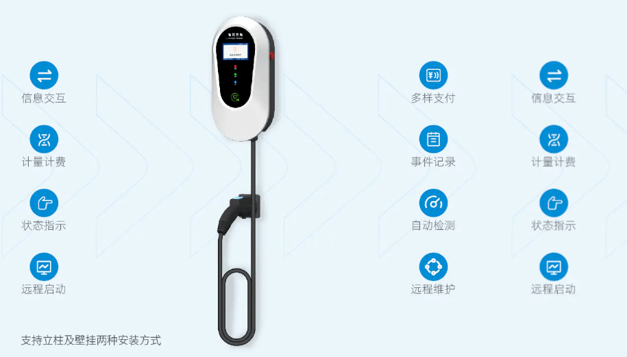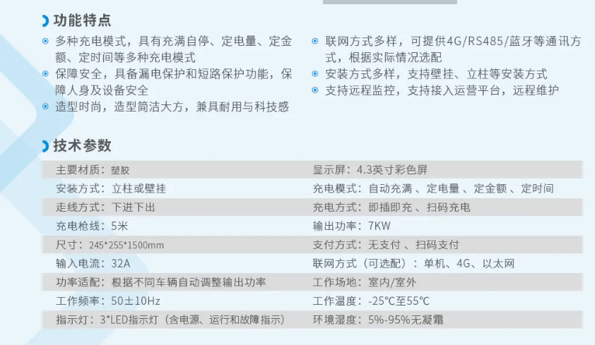 核心功能 充电模式:自动充满、定电量、定金额、定时间 充电方式:即插即充、扫码充电 支付方式:无支付、扫码支付 联网方式:单机、4G、以太网 (选配) 安全保护:支持过压、欠压、过载、短路、漏电、接地、过温、低温、防雷和急停保护 安规标准:GB/T18487、GB/T27930、GB/T34657、GB/T34658、NB/T33008