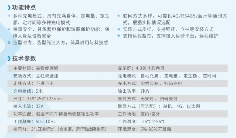 核心功能 充电模式:自动充满、定电量、定金额、定时间 充电方式:即插即充、扫码充电 支付方式:无支付、扫码支付 联网方式:单机、4G、以太网 (选配) 安全保护:支持过压、欠压、过载、短路、漏电、接地、过温、低温、防雷和急停保护 安规标准:GB/T18487、GB/T27930、GB/T34657、GB/T34658、NB/T33008
